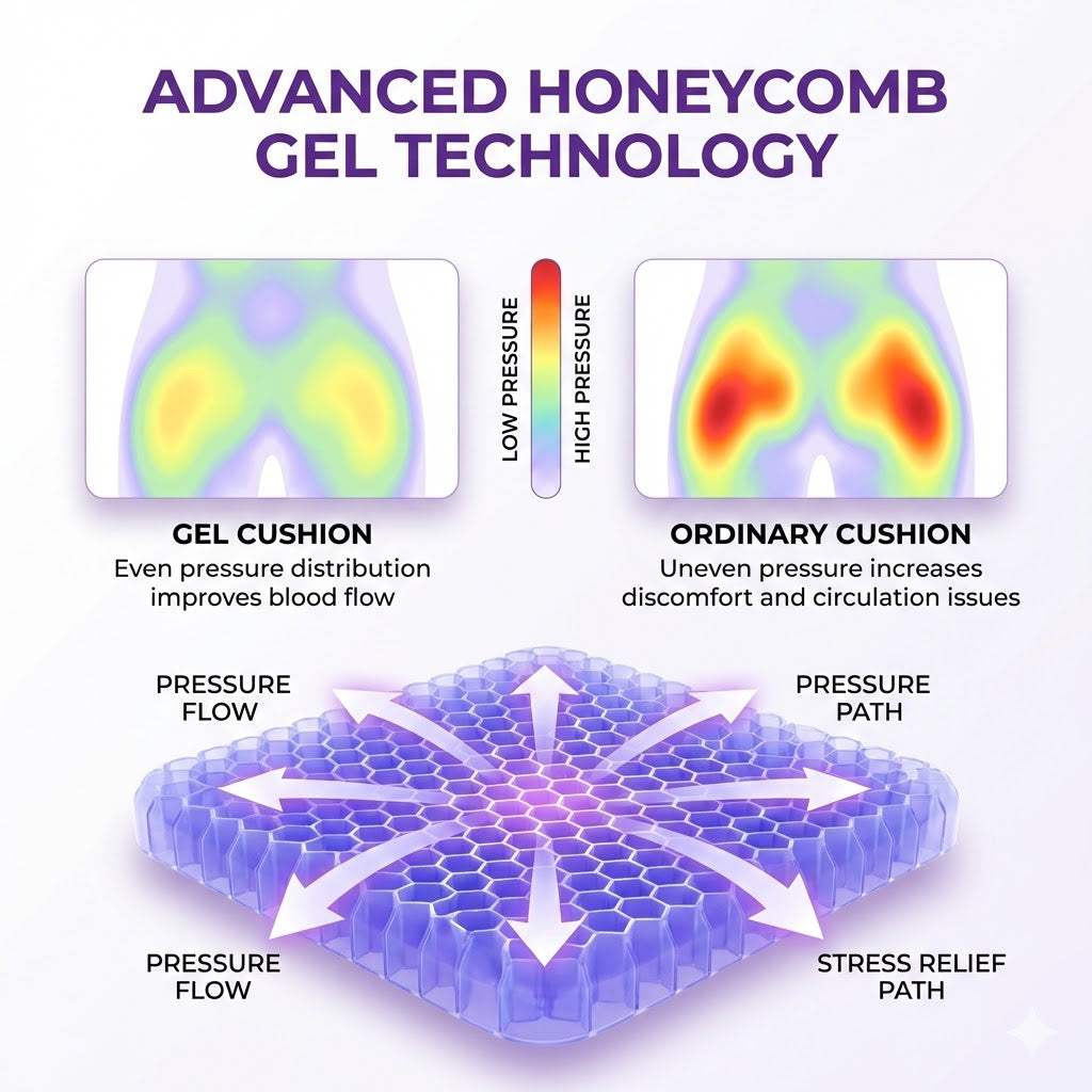 Open honeycomb gel lets air flow through the cushion to reduce heat and sweat—perfect for long drives, office chairs, and gaming.